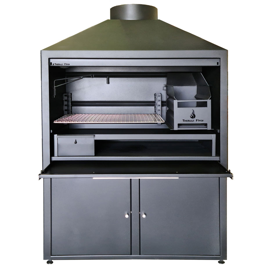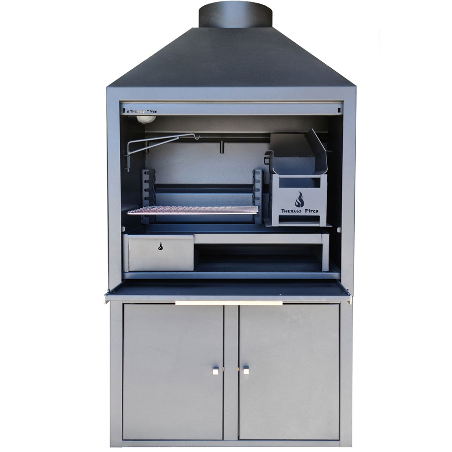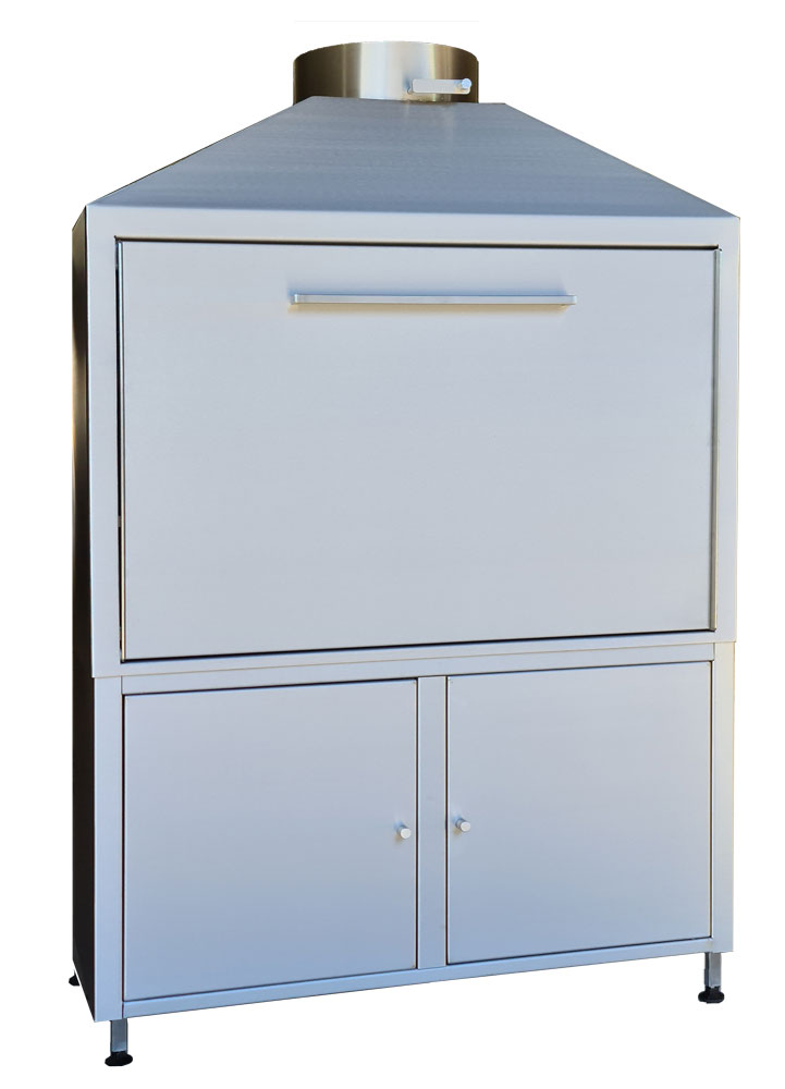 Our 1200 mm Professional Freestanding braai is manufactured with our own unique double-skin sides, and comes complete with a cabinet. The double-skin sides keeps the outside of the braai cooler to the touch. It also includes 2.4 m flue, a slip-on turbo cowl, ceiling plate, re-inforced coalmaker, ashpan with ashtrap and -tray, stainless steel grid, potjiehook, poker, lightfitting and a door that slides away beneath the ashpan. The cabinet is supplied with adjustable feet.